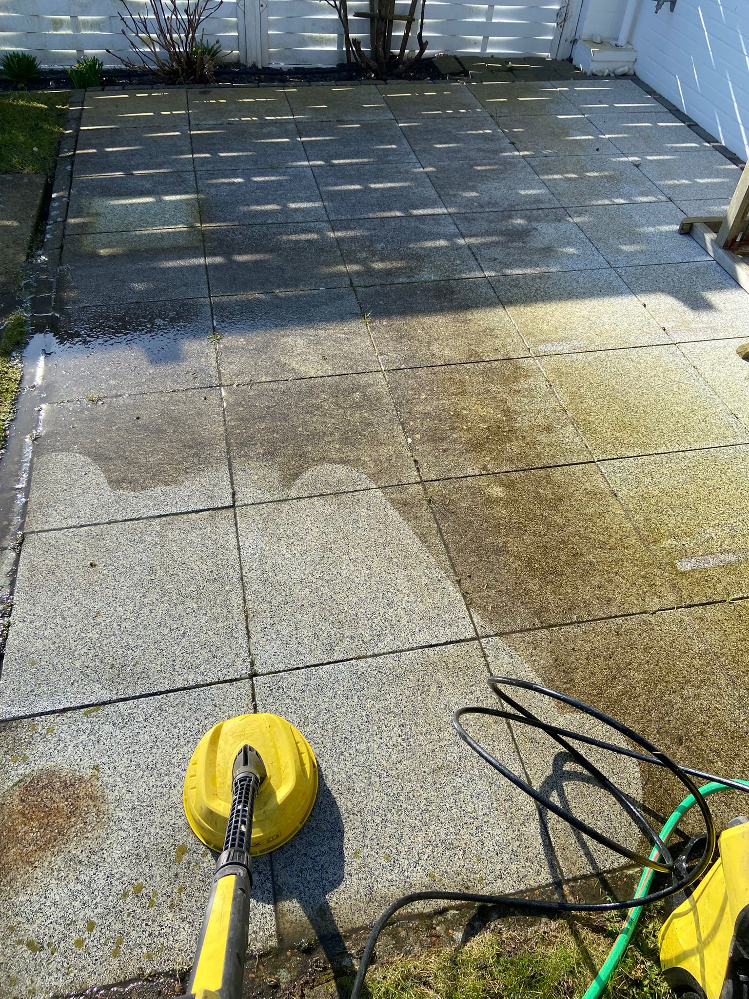 Glänzende Terrasse leicht gemacht: Hochdruckreinigung entfernt Schmutz, Algen & Moos – für perfekte Sommerabende.